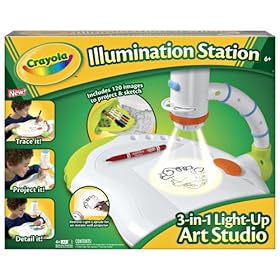 Project it! Sketch it! Perfect it! The Crayola Illumination Station is three great drawing tools in one! Use the light desk mode to trace one of the 10 cool background scenes?or create your own. Switch to projector mode and insert an image disc. Choose from 120 characters to project and trace into your design. Add color and shading to your creation with the included Mini Super Tip markers to complete your work. You can even detach the projector and use it as a flashlight!